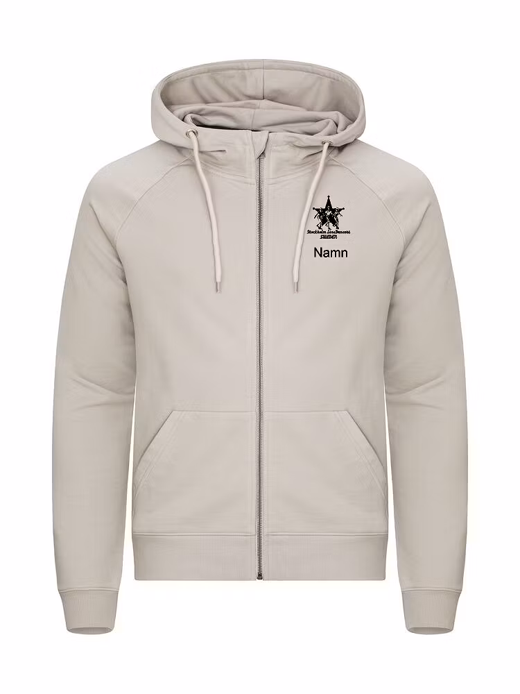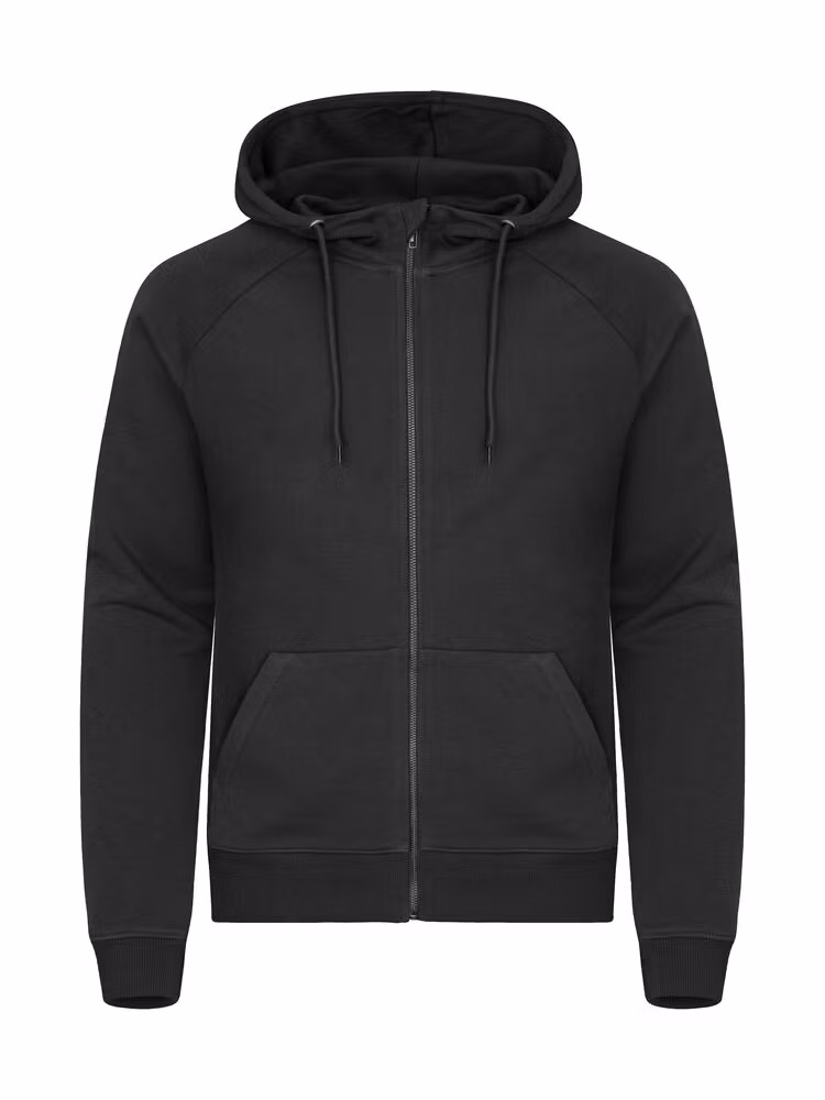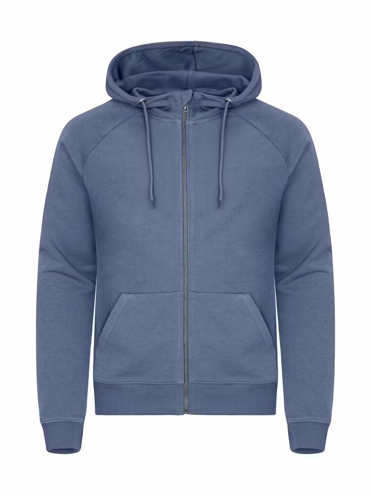 Unisex hoodie med hel dragkedja, gjord av French terry-kvalitet och en bomull-återvunnen polyesterblandning. Har raglanärmar, en känguruficka och ett skyddsflik överst vid dragkedjan. Hoodien har ett dubbel lager för extra stabilitet. Dragsnörets ändar och öljetter är gjorda av metall. Den elastiska 2x2-ribben har enkel söm vid hals, ärmslut och nederkant.